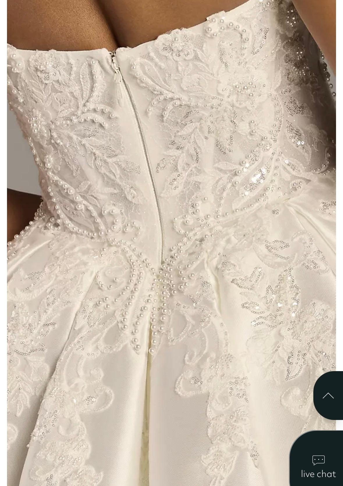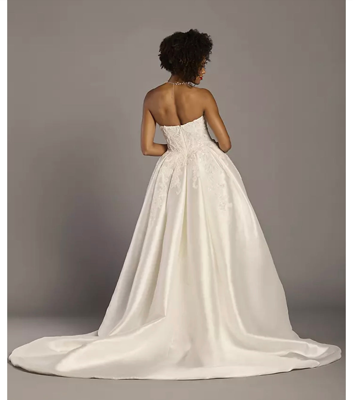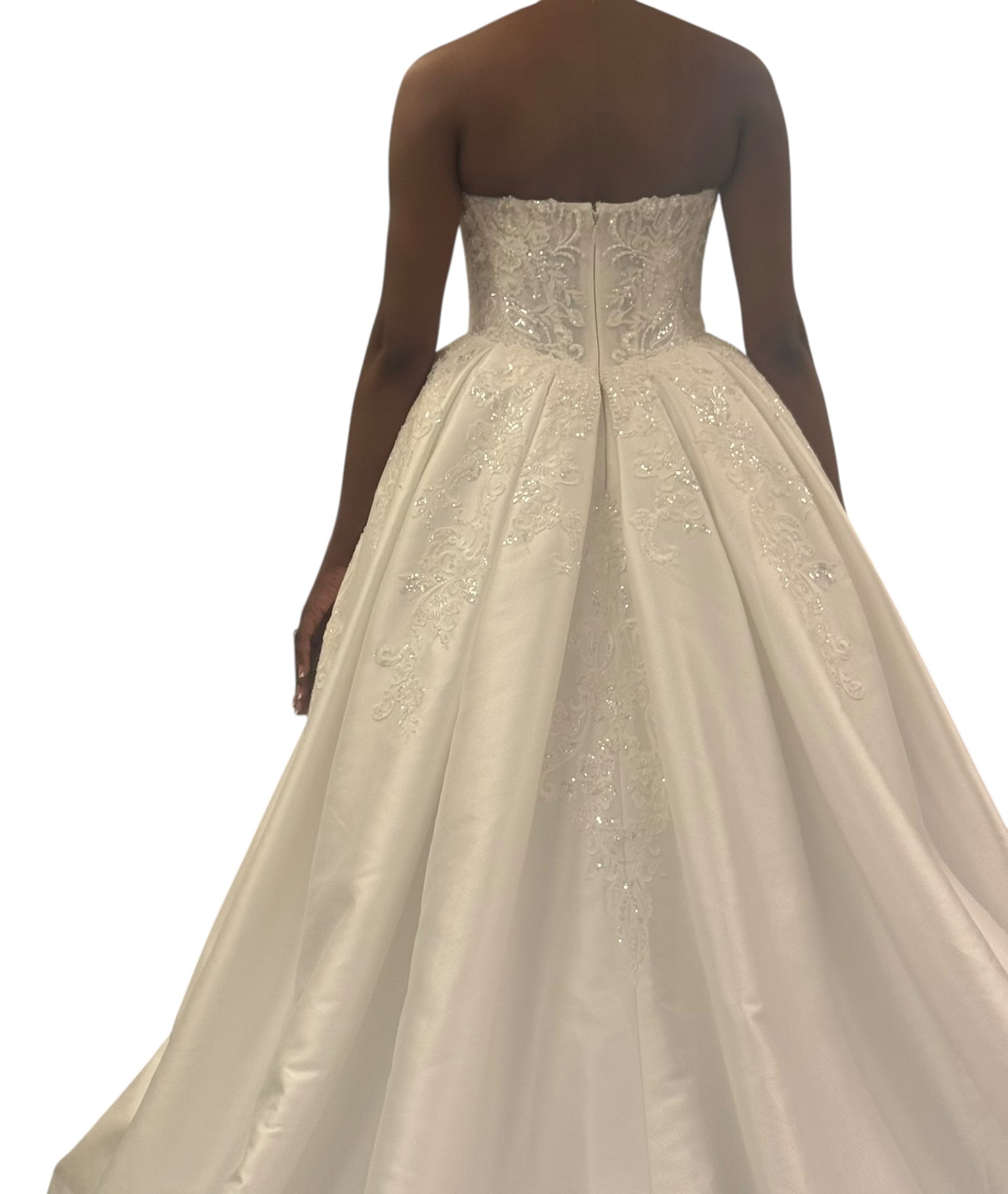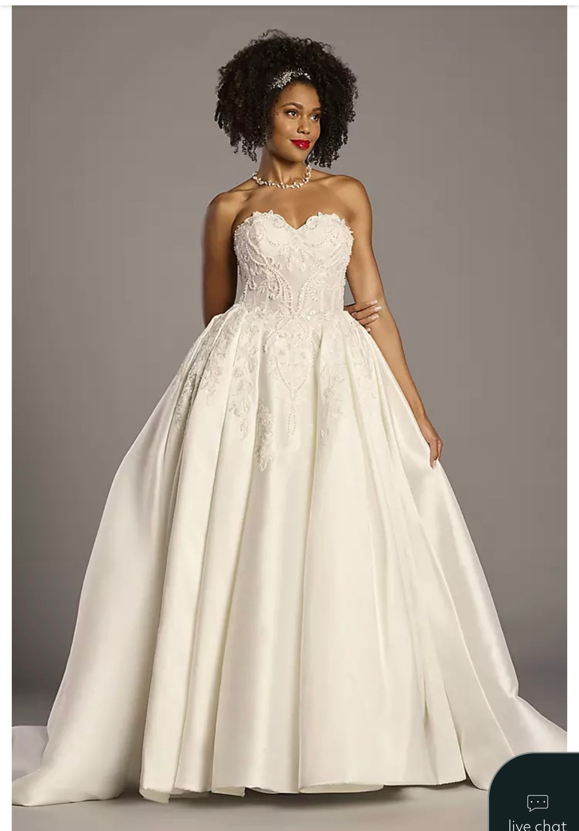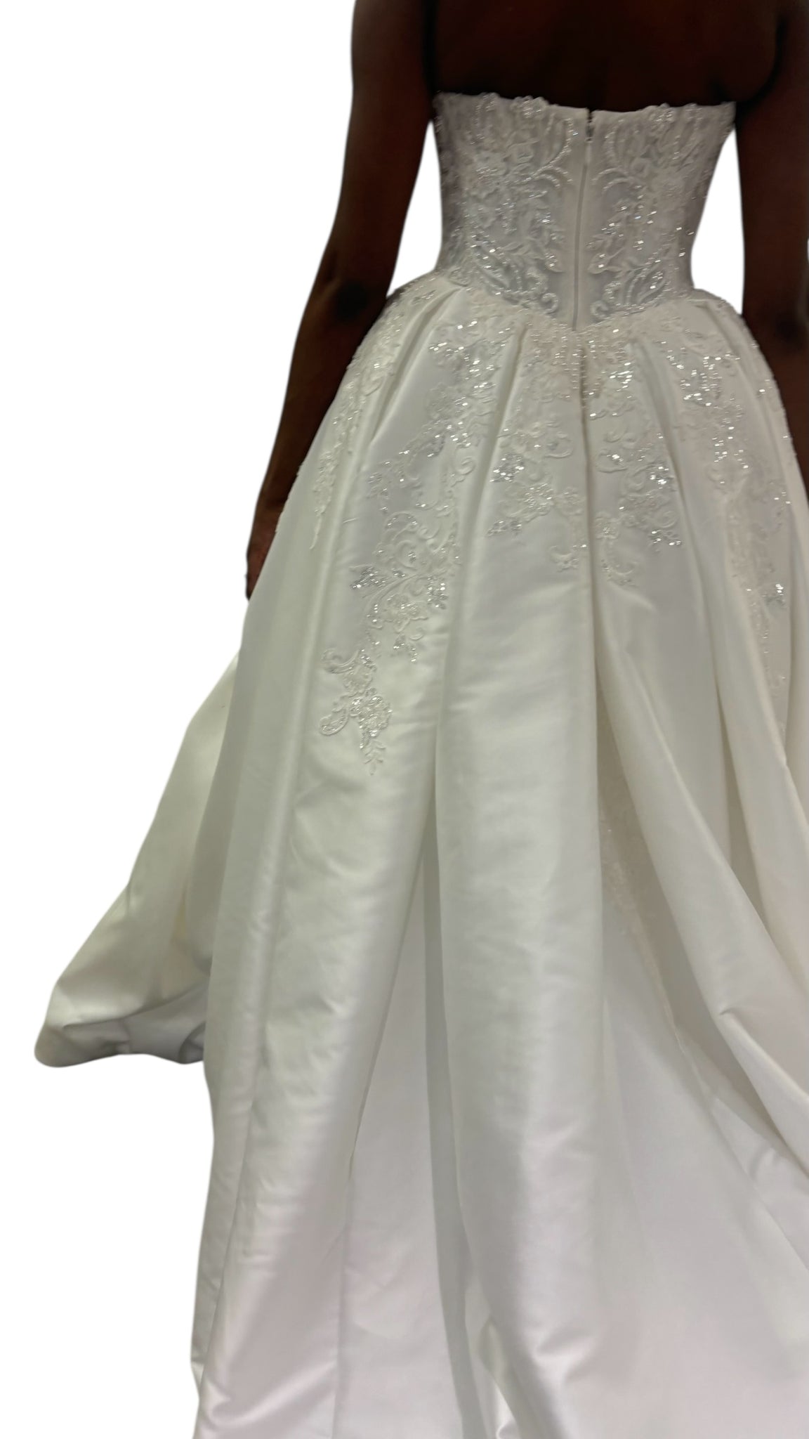 Classic strapless sweetheart gown by Oleg Cassini. Intricate embroidered bodice adds delicate detail. Full voluminous skirt creates a timeless bridal silhouette. Elegant and romantic design for formal occasions.